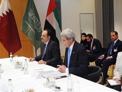Munich /Information Office/ 07 February 2015/ HE Qatar's Foreign Minister Dr. Khalid bin Mohammed Al Attiyah took part in a meeting for GCC Foreign Ministers and US Secretary of State John Kerry on the sidelines of Munich Security Conference. Talks during the meeting focused on ways of enhancing relations and cooperation between the GCC countries and the United States in all political, economic and security areas. They also exchanged views on the latest regional and international developments, mainly the peace process, the Syrian crisis and the situation in Yemen.