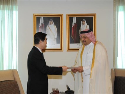 Doha /Information Office/ 26 May 2015/ HE Foreign Minister Dr Khalid bin Mohammad Al Attiyah received today a copy of the credentials of Lee Chen as ambassador of the People's Republic of China to Qatar. HE Al Attiyah wished success for the Chinese ambassador in his mission and more development and growth to bilateral relations between the two countries. A number of Foreign Ministry officials attended the handing over of credentials.