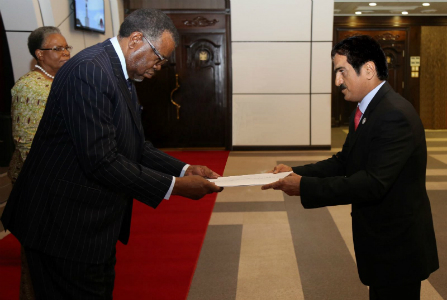 HE President of Namibia Hage Geingob received Friday the credentials of HE Abdullah bin Hussein Al Jaber as an Ambassador extraordinary and plenipotentiary of the State of Qatar to the Republic of Namibia.
