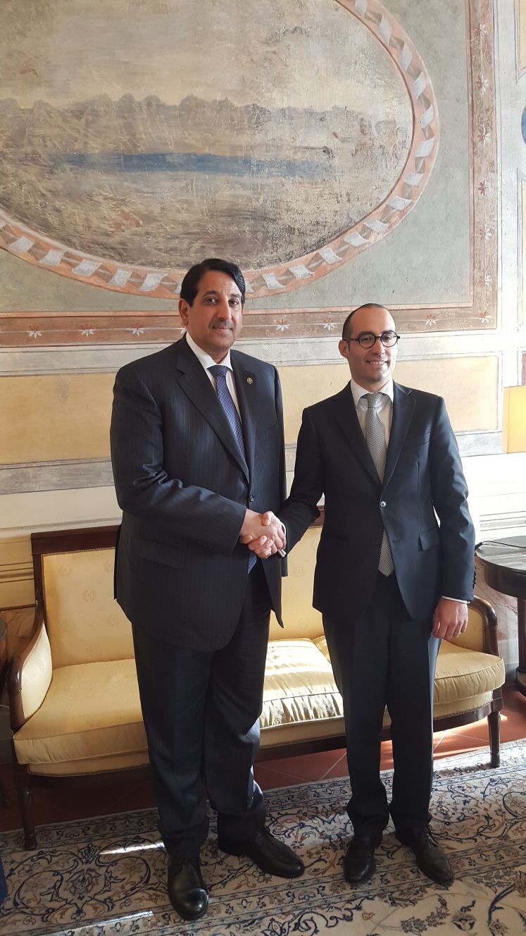 سان مارينو/المكتب الإعلامي/01 أكتوبر 2017/ اجتمع سعادة السيد نيكولا رينزي سكرتير الدولة للشؤون الخارجية ووزير العدل بجمهورية سان مارينو، مع سعادة السيد عبدالعزيز بن أحمد المالكي سفير دولة قطر غير المقيم لدى سان مارينو .